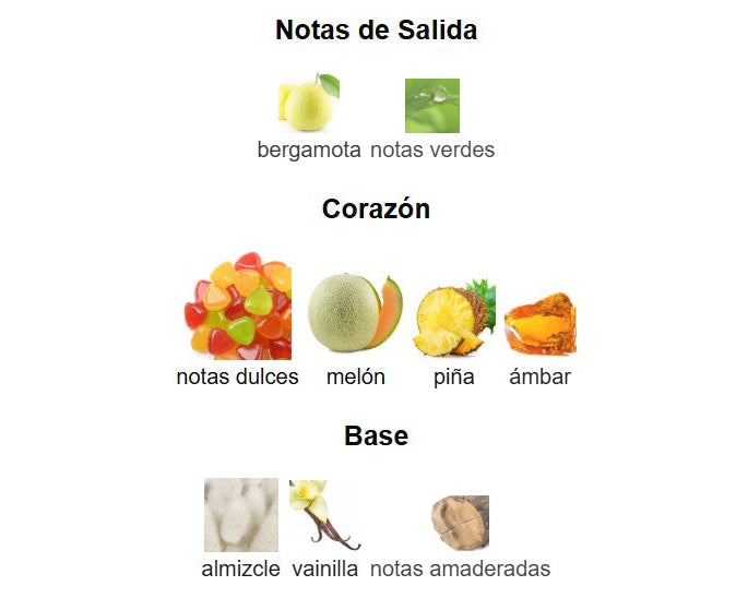 🔹 Notas de corazón: Melón, piña, ámbar y notas dulces, creando un toque exótico, jugoso y ligeramente gourmand.