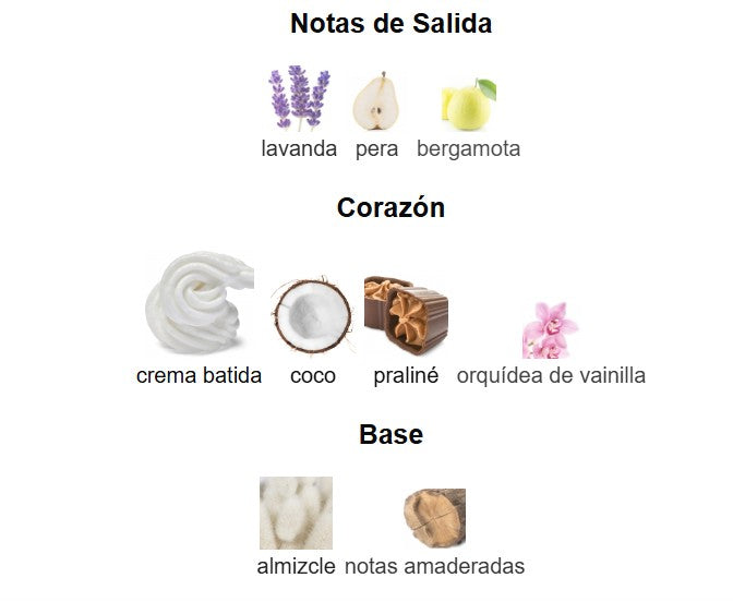🔹 Notas de corazón: Crema batida, praliné, coco y orquídea de vainilla, aportando una dulzura aterciopelada y una textura cremosa irresistible.