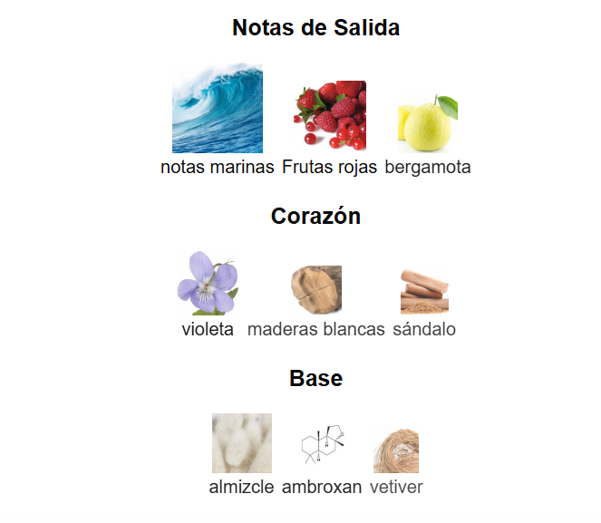 Notas de salida: Notas marinas, frutas rojas y bergamota, que aportan una apertura fresca y ligeramente dulce