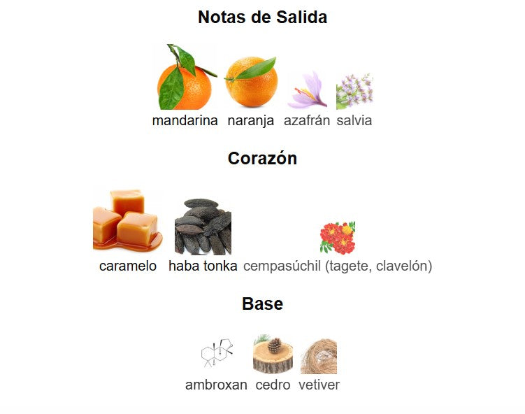 Salida: Mandarina, naranja, azafrán y salvia, que aportan una apertura fresca y especiada.