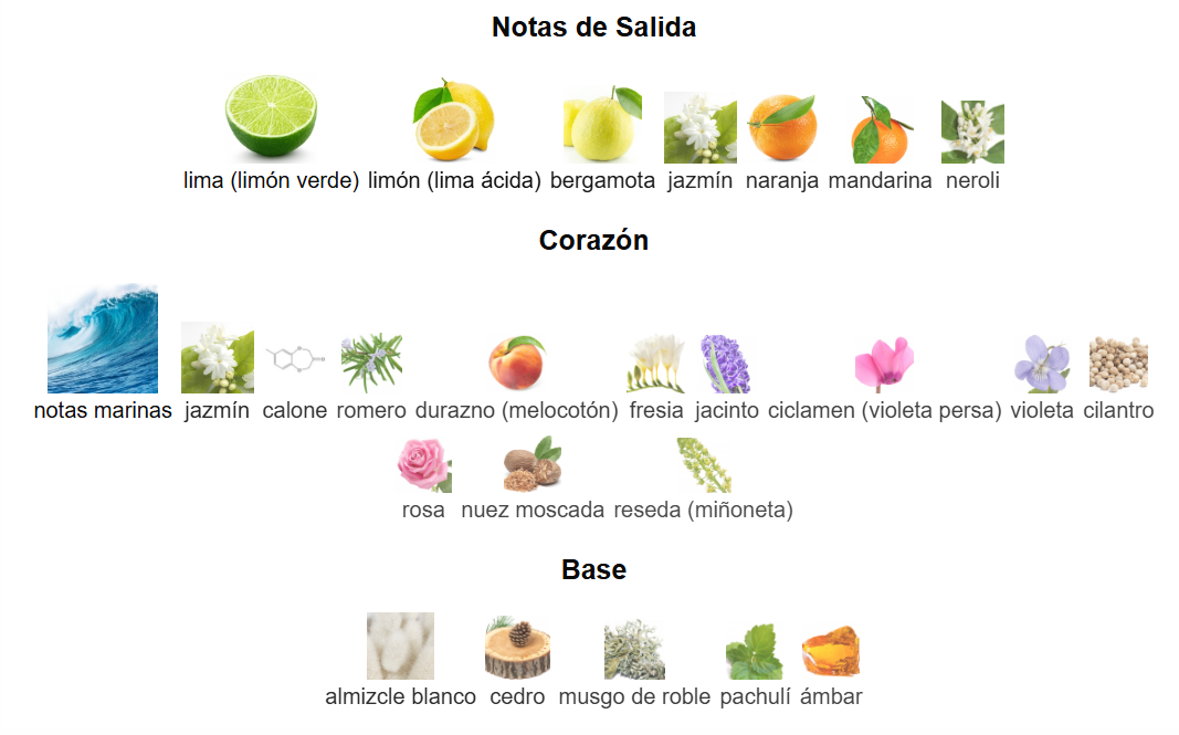 Notas de corazón: Jazmín, calone, romero y notas marinas. Un corazón limpio y acuático que evoca la brisa del Mediterráneo.