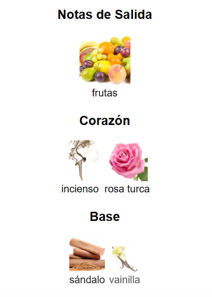 Fondo: Almizcle, ámbar, vainilla, sándalo