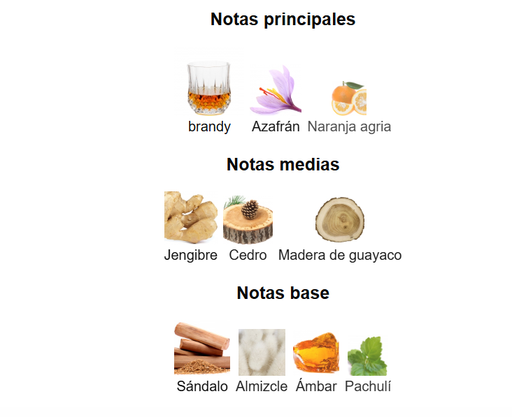Notas de fondo: Ámbar, pachulí, almizcle y vainilla, una base cálida y envolvente que deja una impresión irresistible.