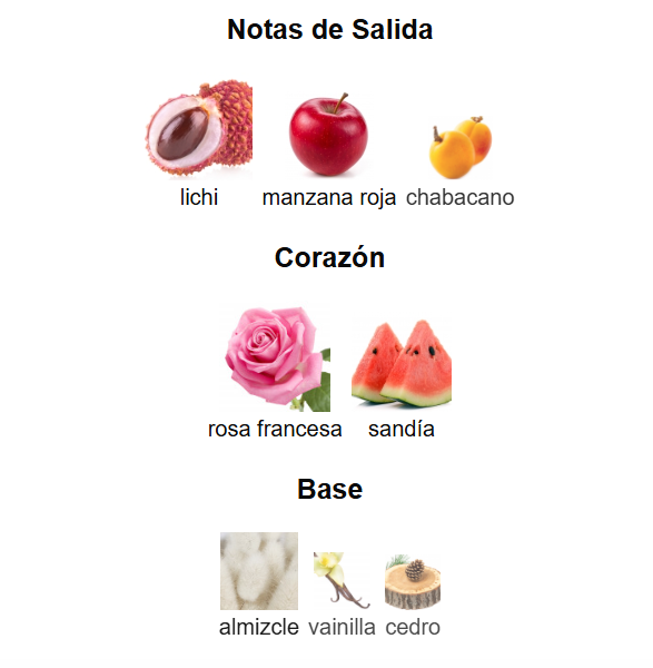 Notas de salida: Litchi, chabacano y manzana roja, una apertura jugosa y efervescente que deslumbra con su frescura.