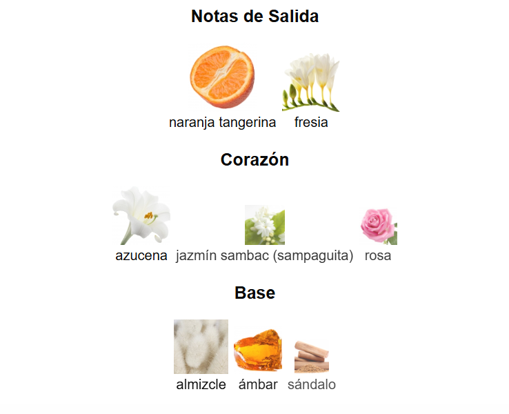 Notas de corazón: Rosa y lirio, un bouquet floral sofisticado y romántico que añade un toque de elegancia.