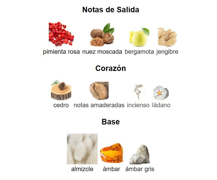 Notas de salida: Nuez moscada, pimienta rosa, bergamota y jengibre, que aportan una apertura especiada y ligeramente cítrica.