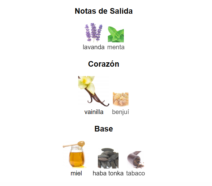 Esta combinación de notas crea una fragancia oriental fougère que equilibra la frescura de la lavanda y la menta con la calidez de la vainilla y el benjuí, culminando en una base rica y seductora gracias a la miel, la haba tonka y el tabaco. El resultado es un aroma que evoca sensualidad y sofisticación, ideal para quienes buscan una presencia olfativa distintiva y duradera.