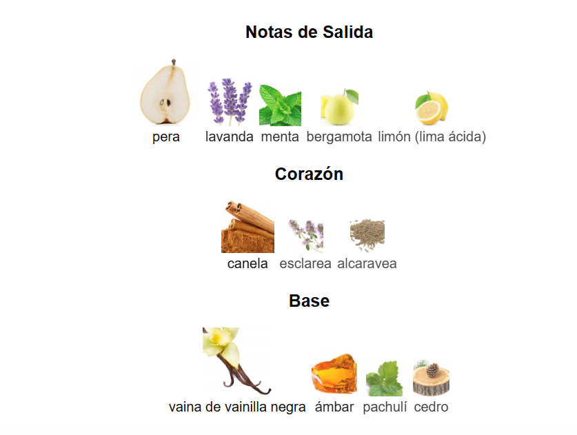 Notas de Salida: Una apertura explosiva y jugosa de pera, limón, lavanda y bergamota, que aporta frescura y un toque afrutado irresistible.