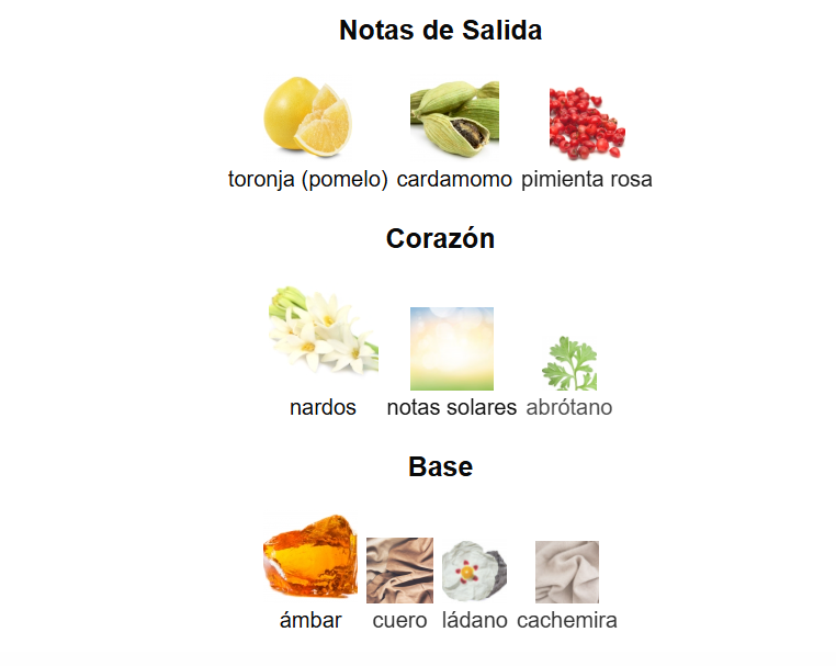 Notas de fondo: Ámbar, almizcle, vainilla y madera de oud, una base cálida y seductora que deja una estela intensa y elegante.