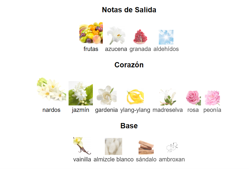Notas de fondo: Vainilla, almizcle y ámbar, una base dulce y seductora que deja una estela duradera y envolvente.