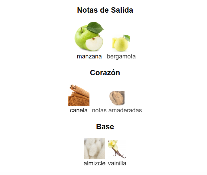 Notas de salida: Bergamota, manzana y canela, una apertura fresca y especiada con un toque frutal vibrante.