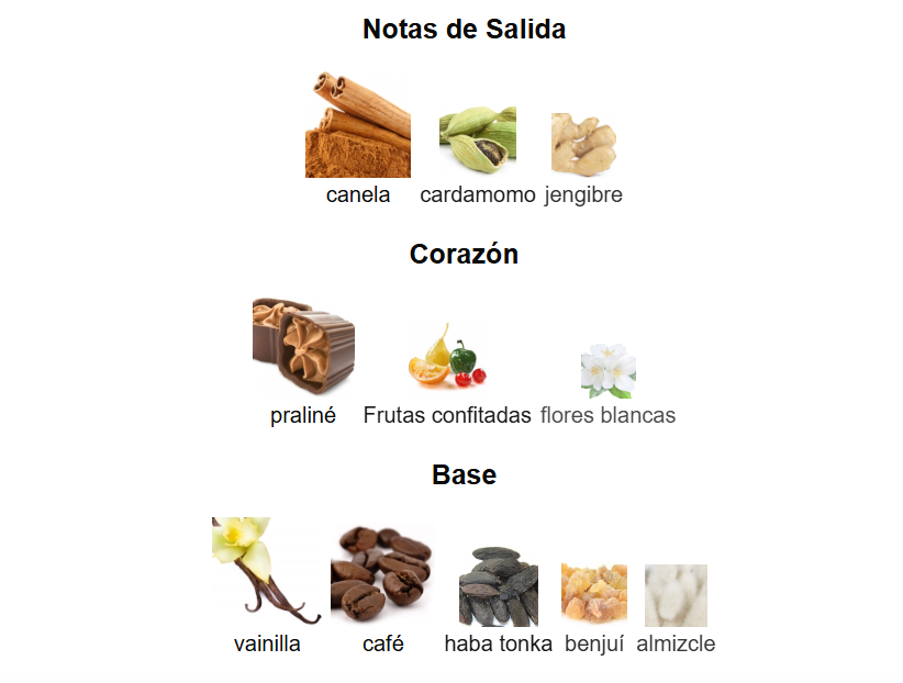Notas de Salida: Café, canela y bergamota, creando un inicio vibrante y especiado con un toque estimulante.