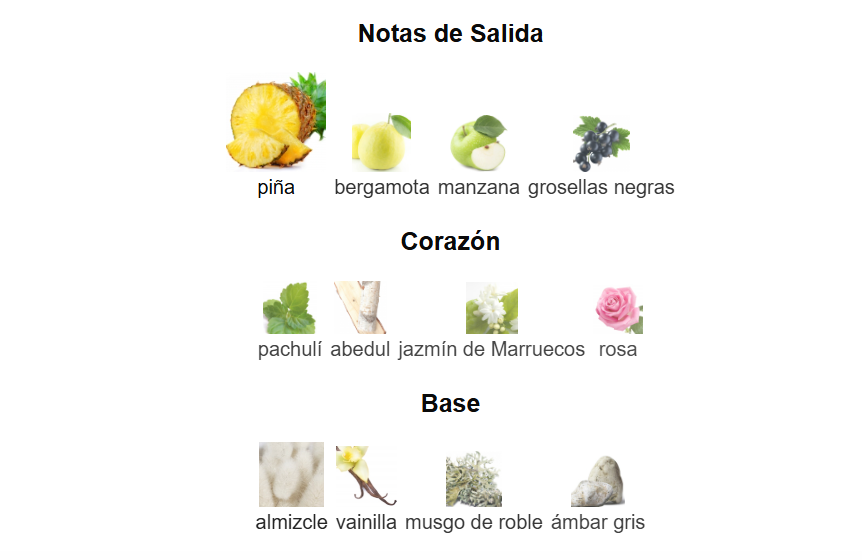 Notas de salida: Bergamota, manzana y pimienta negra, una apertura vibrante y especiada con un toque cítrico y frutal.