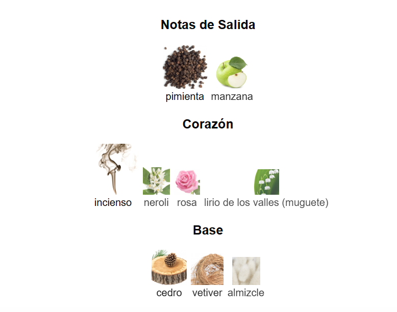Notas de Salida: Pimienta y manzana roja, aportando un inicio vibrante y especiado con un toque afrutado.