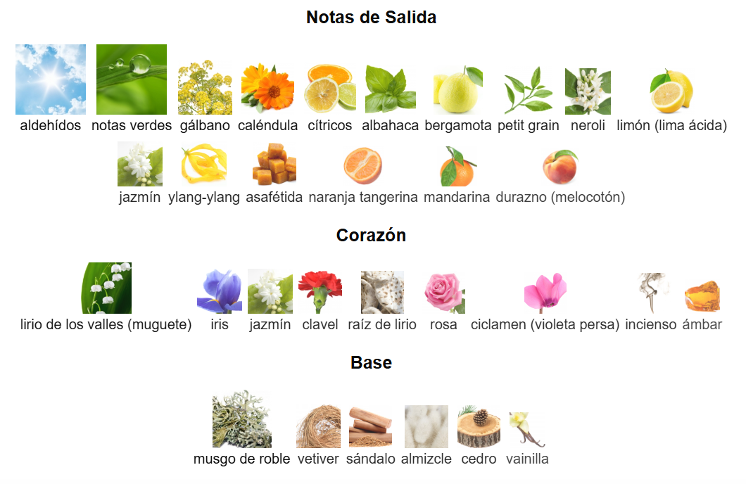 *Notas de salida:*aldehídos, notas verdes, gálbano, cítricos, caléndula, albahaca, bergamota, petit grain, neroli, limón, jazmín, ylang-ylang, asafétida, naranja tangerina, mandarina, durazno