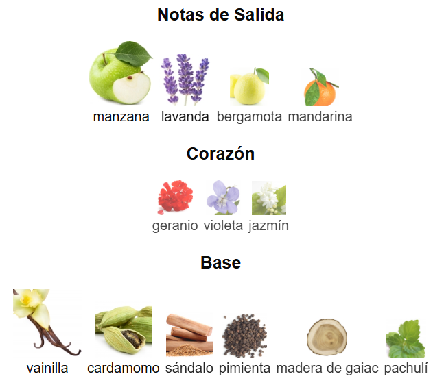 Fondo: Sándalo, vainilla, almizcle, pachulí