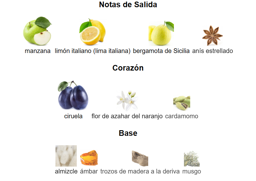 Salida: Manzana, limón italiano, bergamota de Sicilia y anís estrellado.