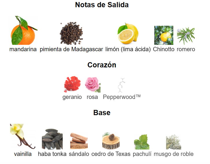 Fondo: Haba tonka, vainilla, sándalo, cedro, pachulí