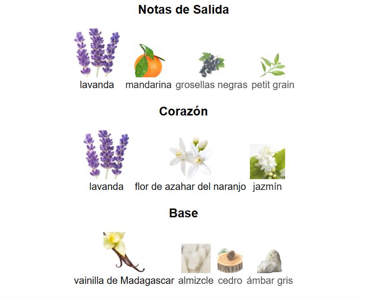 Notas de salida: Esencia de lavanda, mandarina, grosella negra.