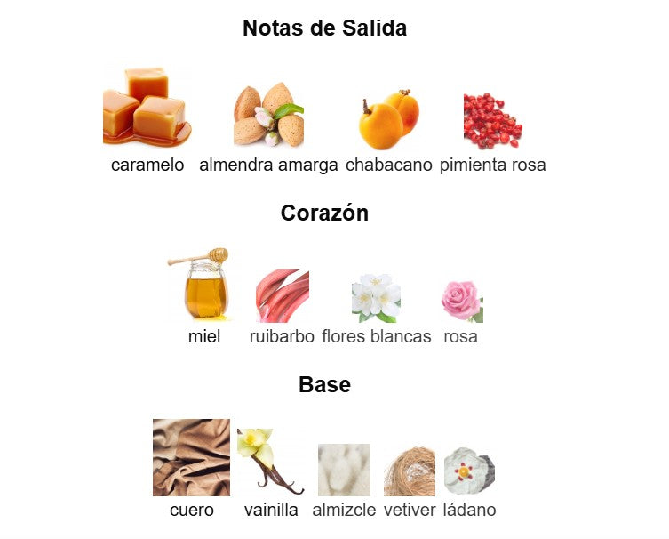 Notas de salida: Caramelo, almendra amarga, chabacano (albaricoque) y pimienta rosa, que aportan una apertura dulce y ligeramente especiada.